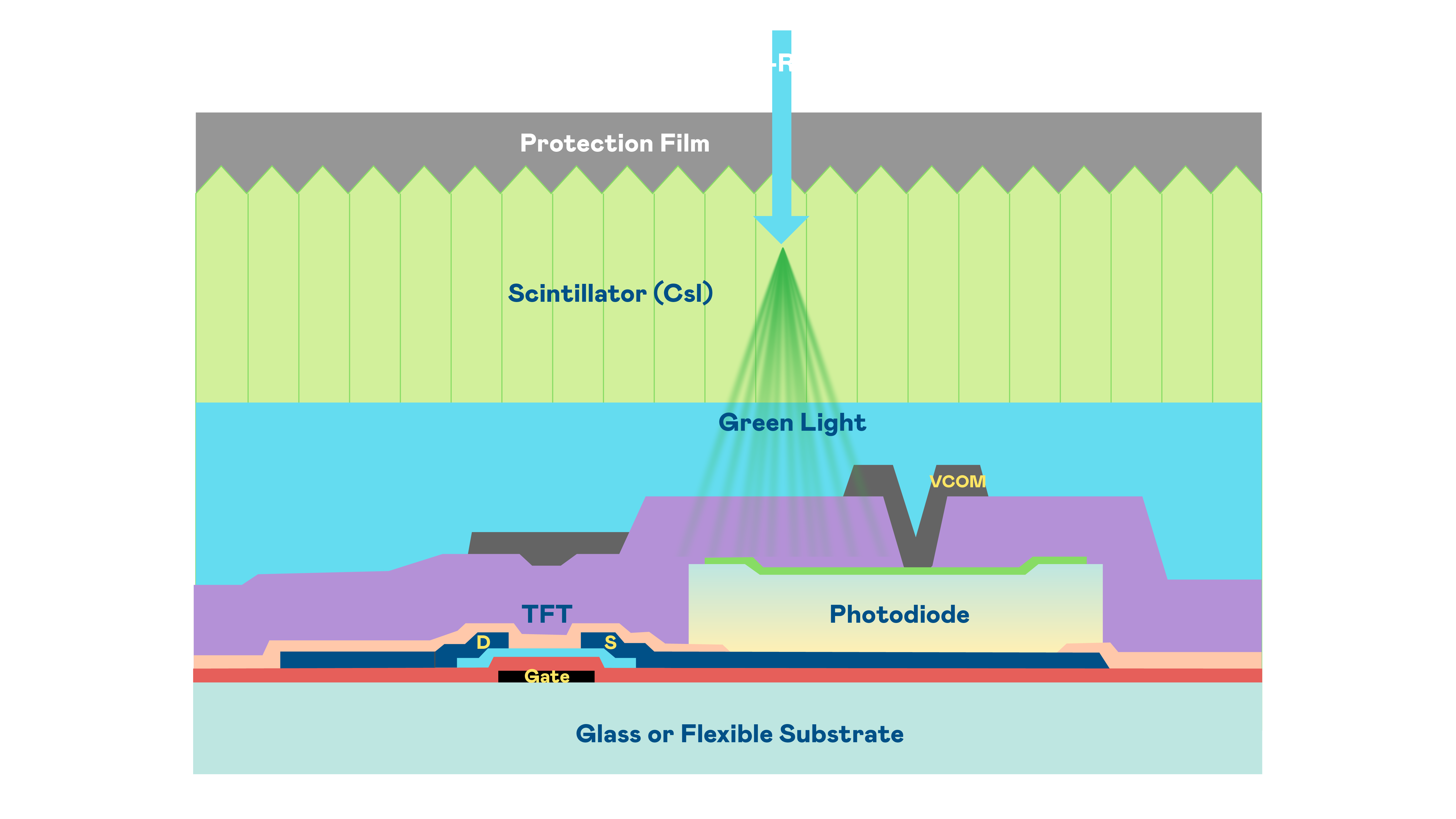 MG不朽情缘的X光影像感測陣列使用薄膜電晶體 (TFT) 作為每個像素的讀取開關,搭配光電二極體(Photodiode)的光電轉換元件,用以感測X光影像訊號。